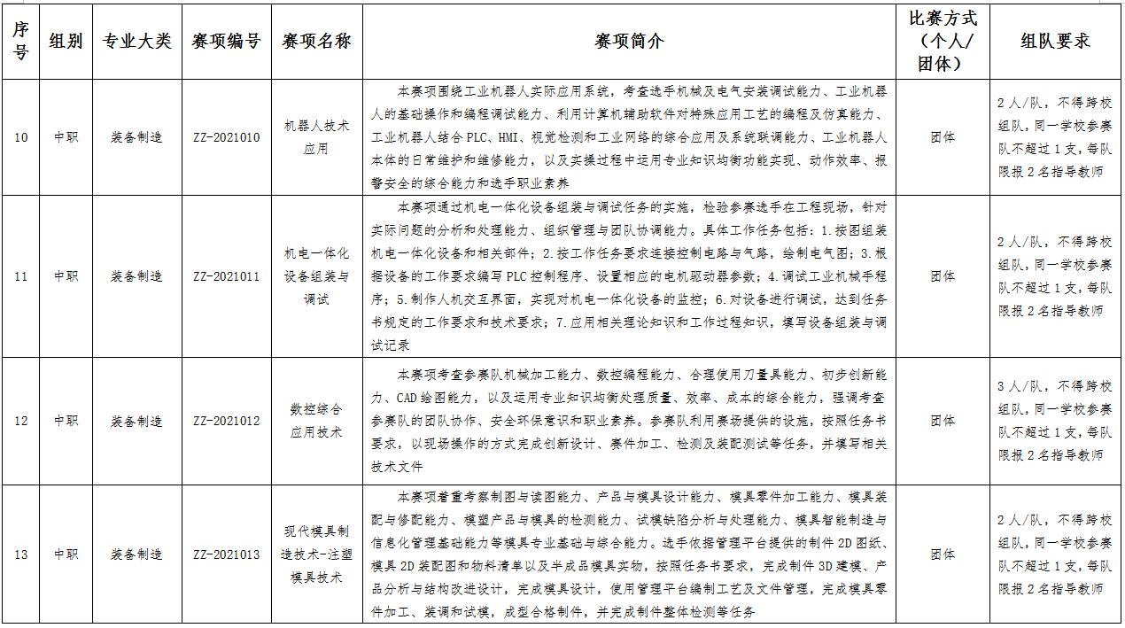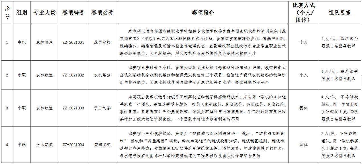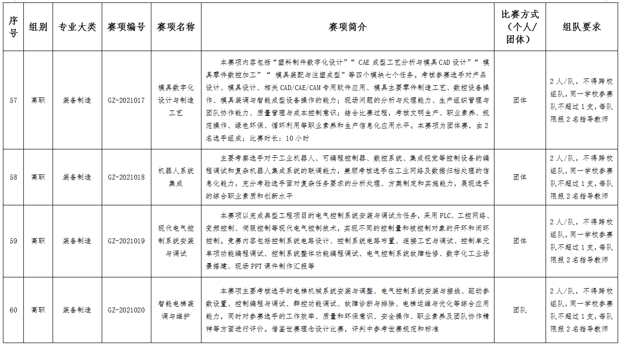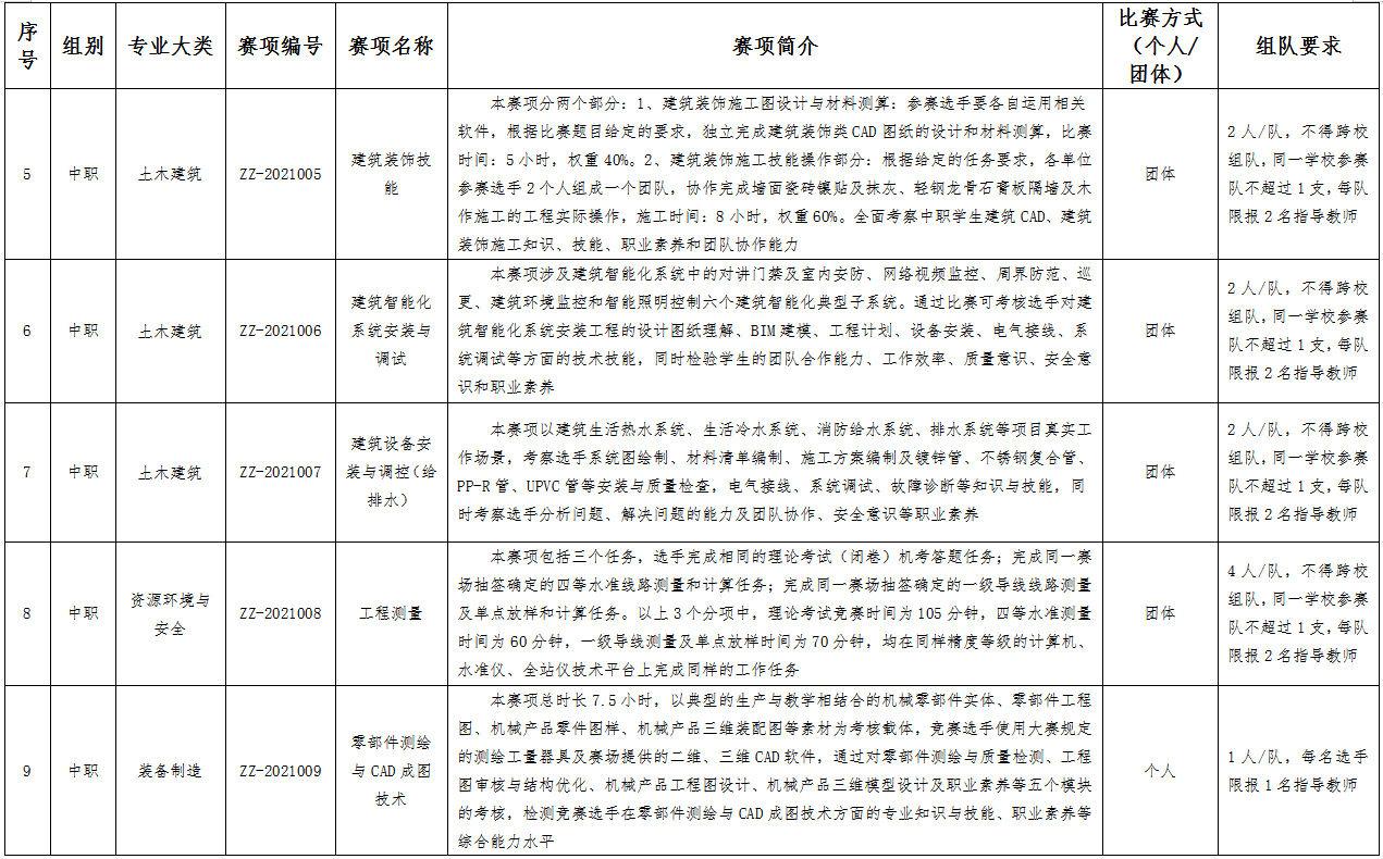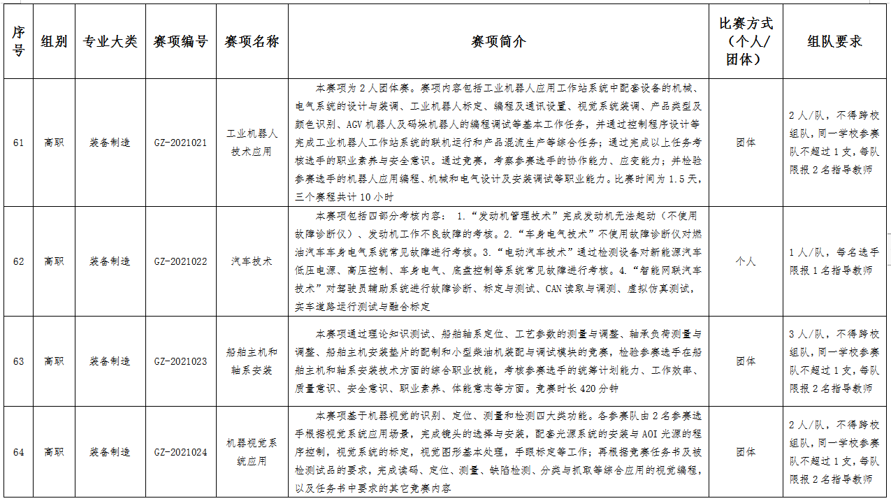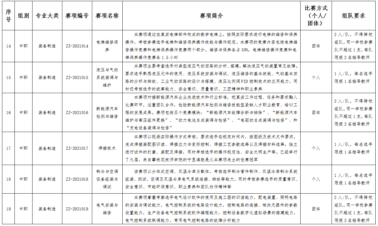 六、比赛项目:比赛项目涵盖102个赛项。其中,中职组10个专业大类,40个赛项;高职组15个专业大类,62个赛项。