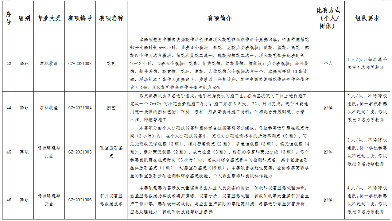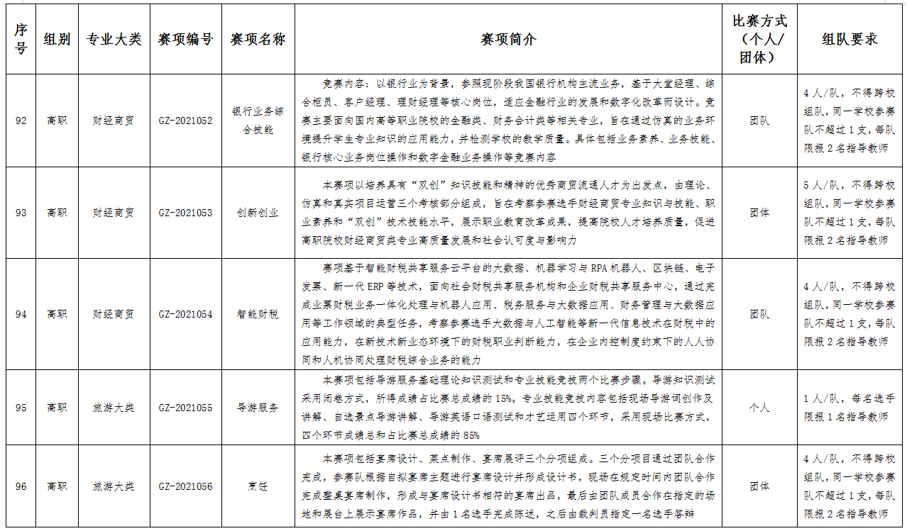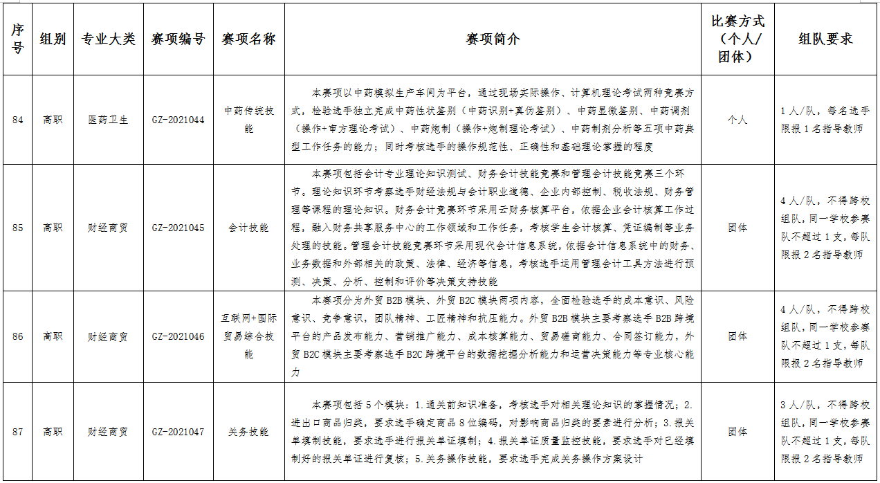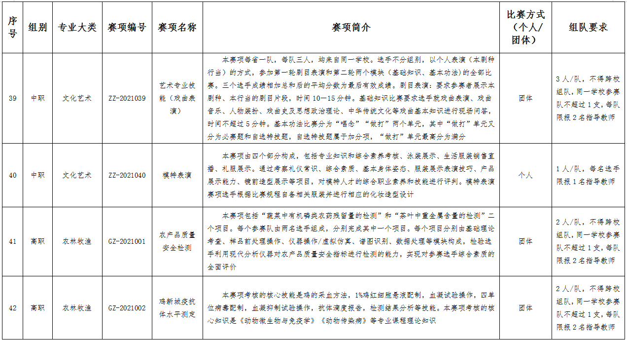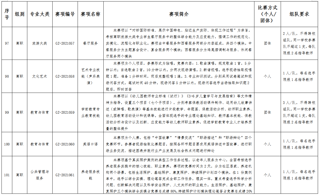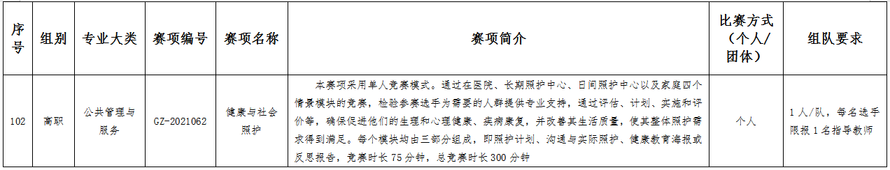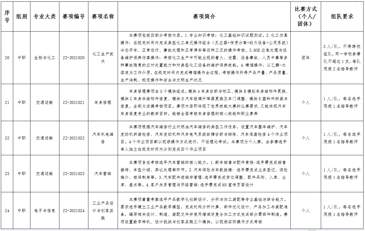 六、比赛项目:比赛项目涵盖102个赛项。其中,中职组10个专业大类,40个赛项;高职组15个专业大类,62个赛项。