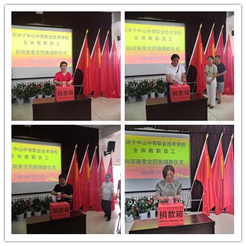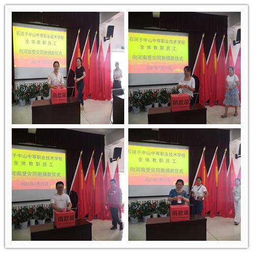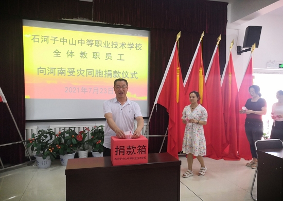 “让我们大家各尽一份力,愿灾区人民早日度过难关.....”7月23日下午,学校党支部、校委会、工会关于向河南受灾同胞捐款的倡议书发出后,全体教职员工积极响应,发扬中华民族“一方有难,八方支援”的光荣传统,以不同的方式踊跃捐款,家住市区的教职工纷纷来到捐款仪式现场奉献爱心,外出学习或家不在市区的教职工通过微信转账方式向灾区人民表达爱意,在短短几个小时里,石河子中山中等职业技术学校全体教职工爱心捐款共11100元,这个巧合的数字,充分表达了石河子“中山人”只要万众一心,定能战胜一切困难的坚定信念,展现了洪涝无情人情浓,大灾时刻有大爱的高尚情怀。