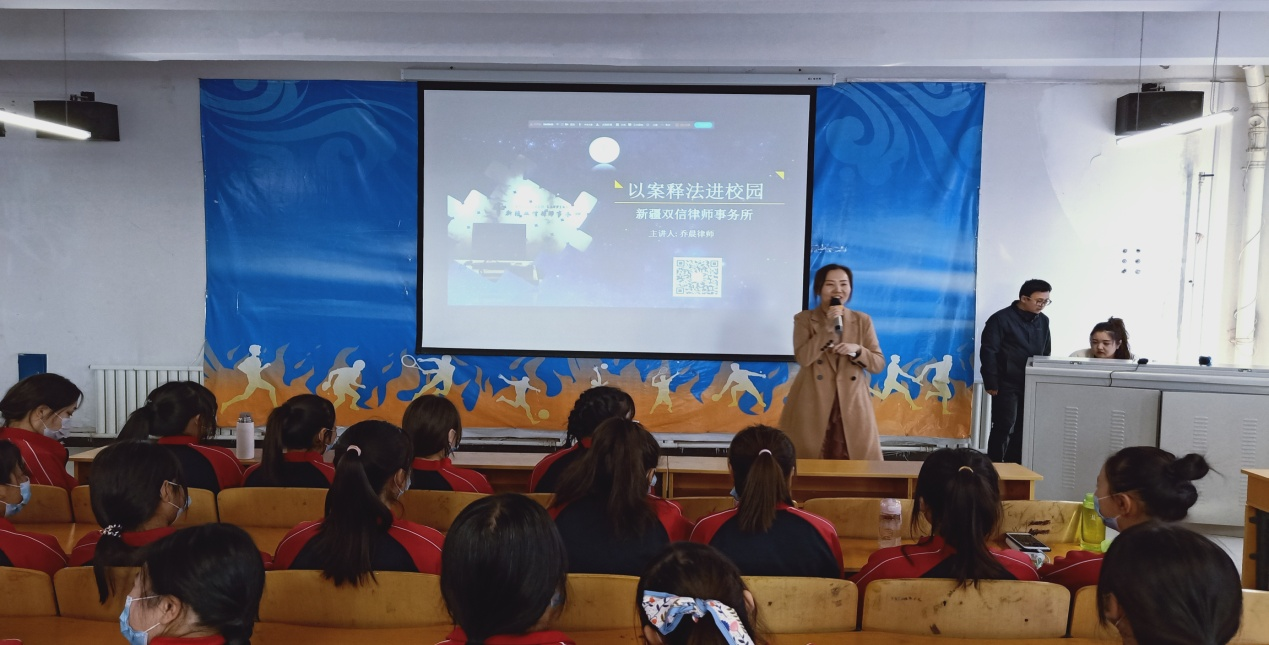 新疆双信律师事务所律师乔晨以图文并茂阐释、现场互动问答等青少年喜闻乐见、浅显易懂的形式,结合未成年人犯罪案例,从什么是法律、什么是犯罪、学生为什么要学习法律、生活中不经意的犯罪、如何抵制不良行为远离犯罪、怎样预防青少年犯罪等方面进行深入浅出地解读。
