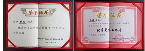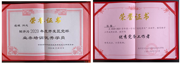 教师是教育之本,师德是教师之魂。张璇老师从教以来,认真钻研教材,探索教学规律,更新教学内容,注重教学实效。张璇老师不仅在教育教学上不断钻研,积极探索,并且在党务工作上也是兢兢业业曾在2021年6月荣获石河子经济技术开发区党工委和石河子中山中等职业技术学校优秀党务工作者荣誉称号,在2020年12月荣获石河子经济技术开发区党工委优秀学员荣誉称号和石河子中山中等职业技术学校优秀党务工作者荣誉称号。